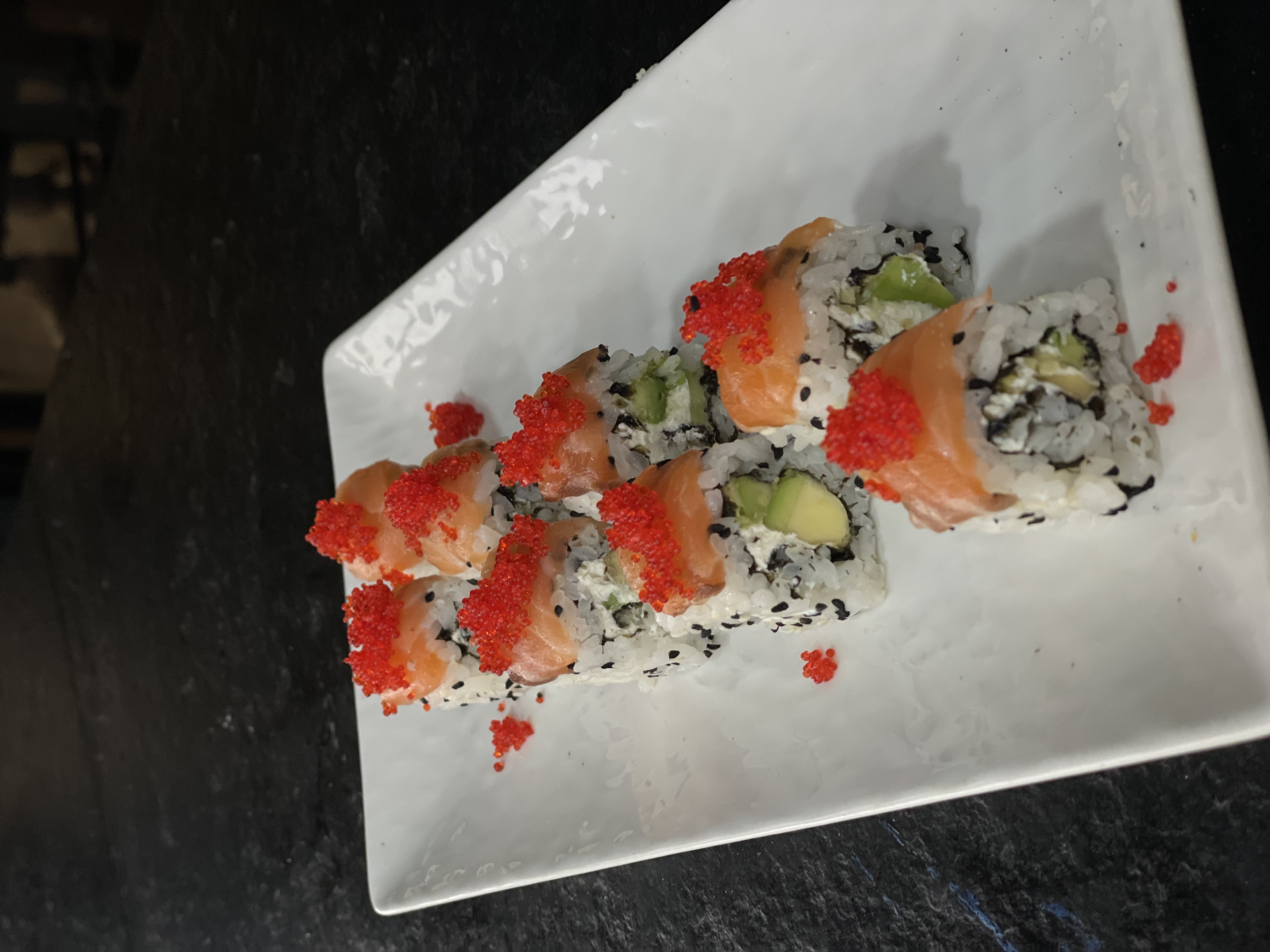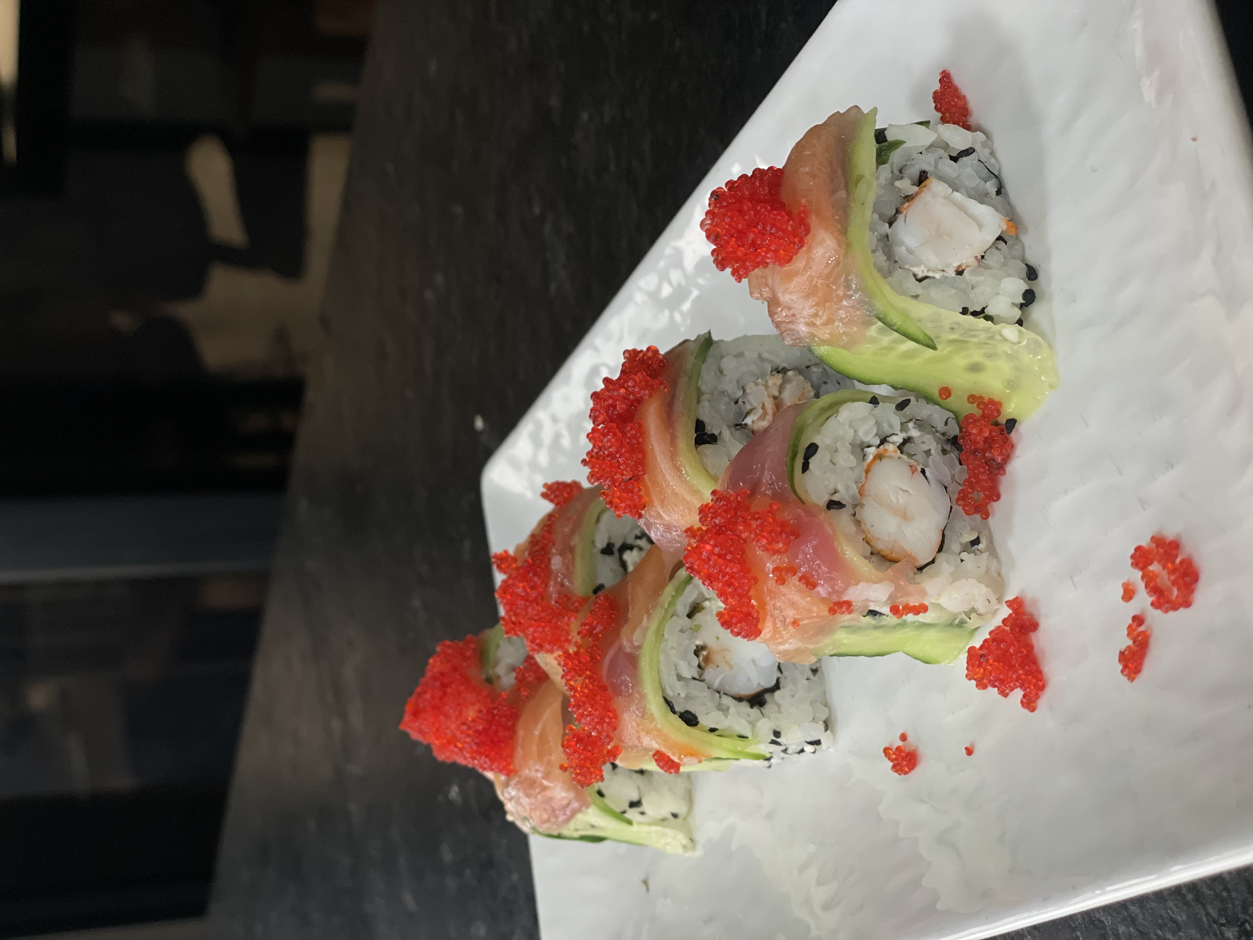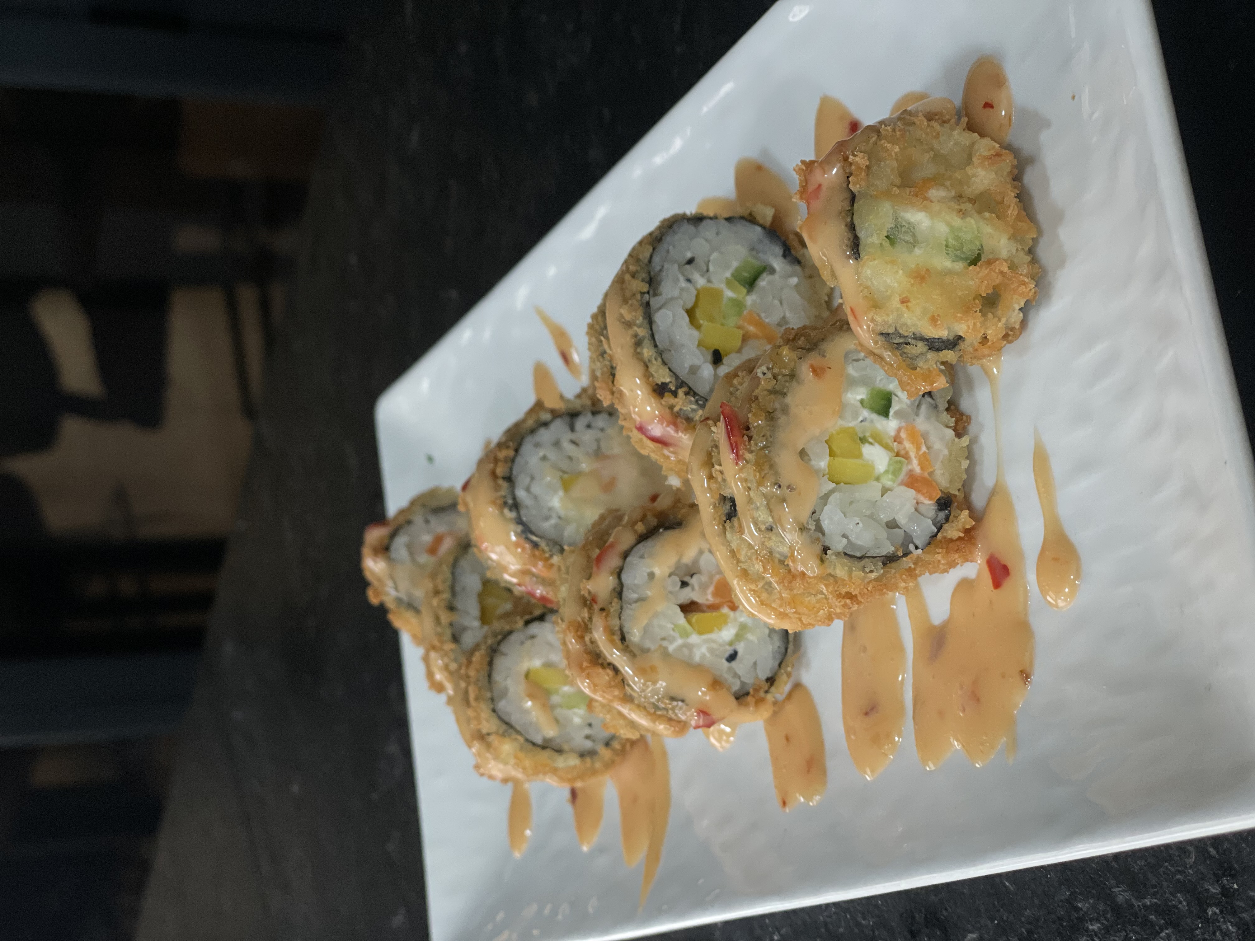 ориз, цели алга, лосос, авокадо, (пржени во темпура)